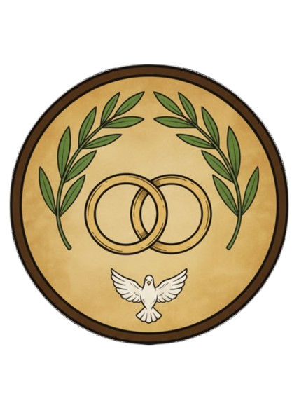 - Significado del Icono: Los anillos entrelazados simbolizan la unidad y la indisolubilidad del vínculo: dos personas distintas que forman una sola carne sin perder su identidad. Las ramas de laurel representan la victoria de la gracia sobre la fragilidad humana y la perseverancia fiel en el amor conyugal. La paloma blanca al pie del símbolo evoca al Espíritu Santo, que sella y vivifica la alianza matrimonial, elevando el amor natural a signo eficaz de la unión de Cristo con su Iglesia. El fondo dorado sugiere la dignidad sacramental y la vocación a la santidad en la vida familiar.